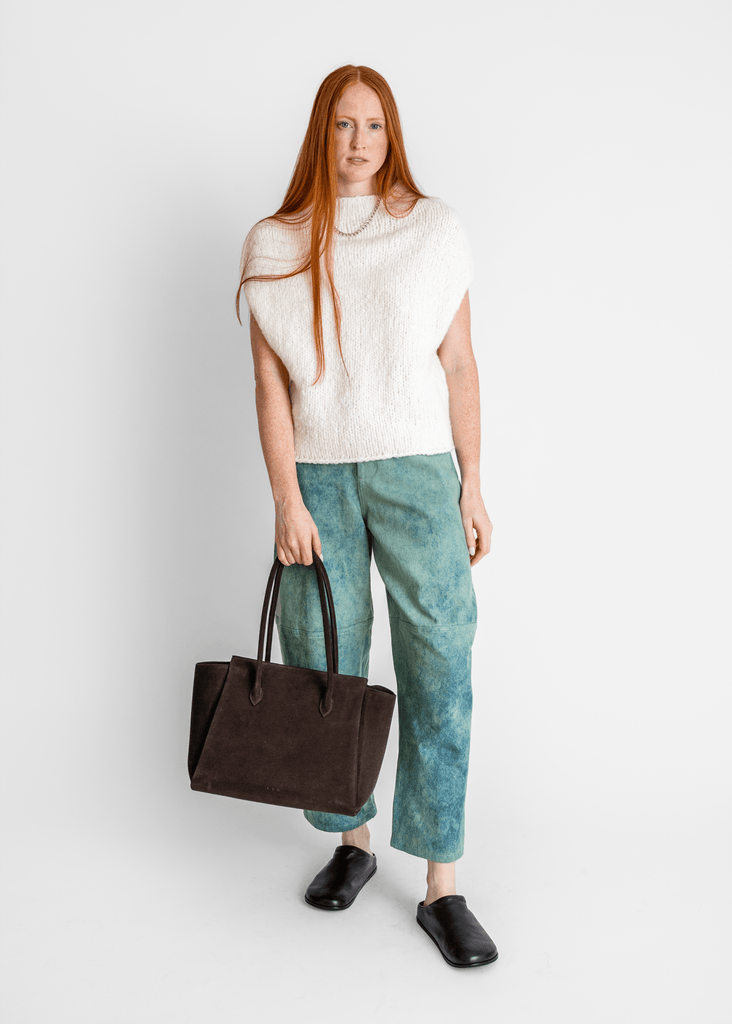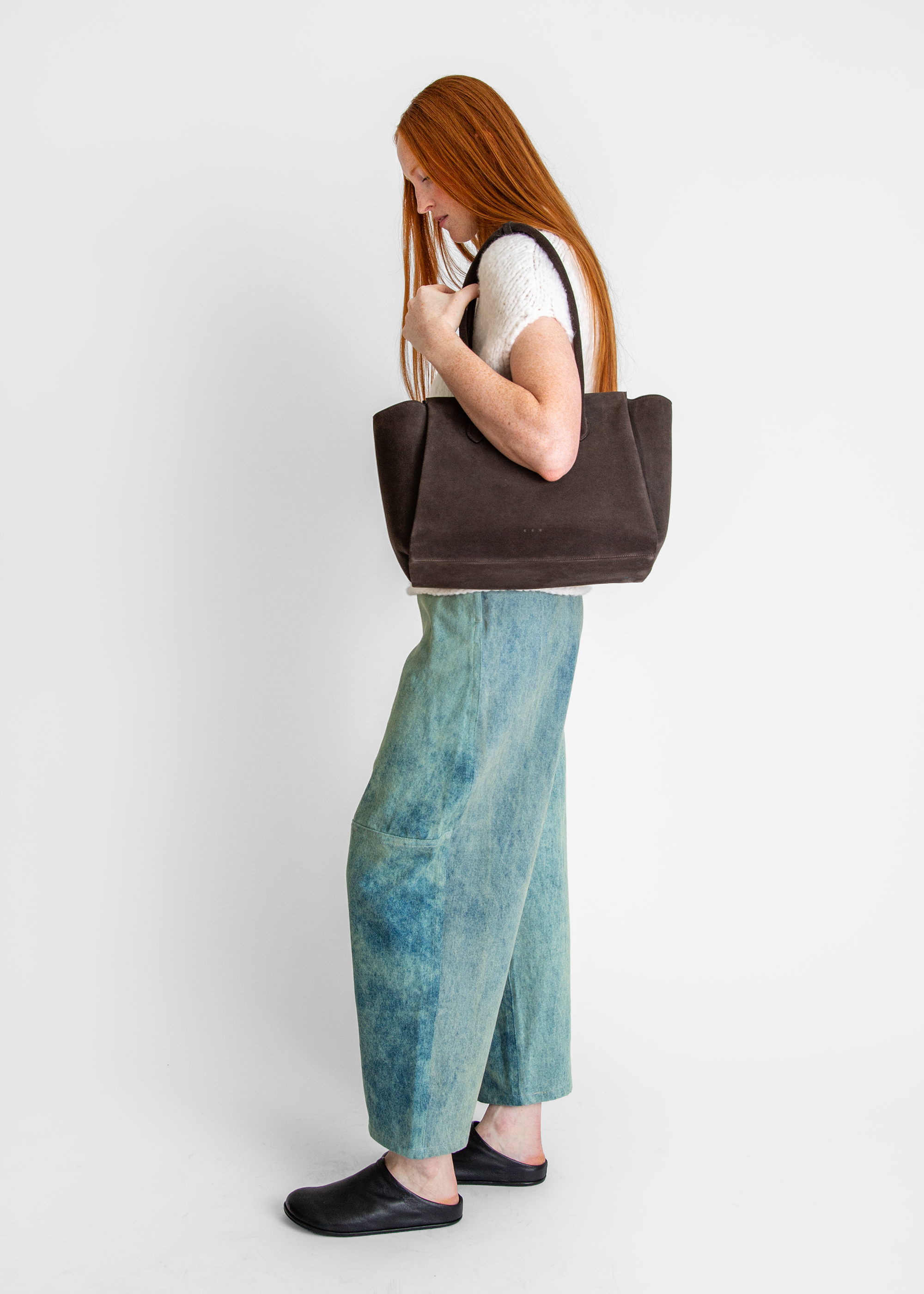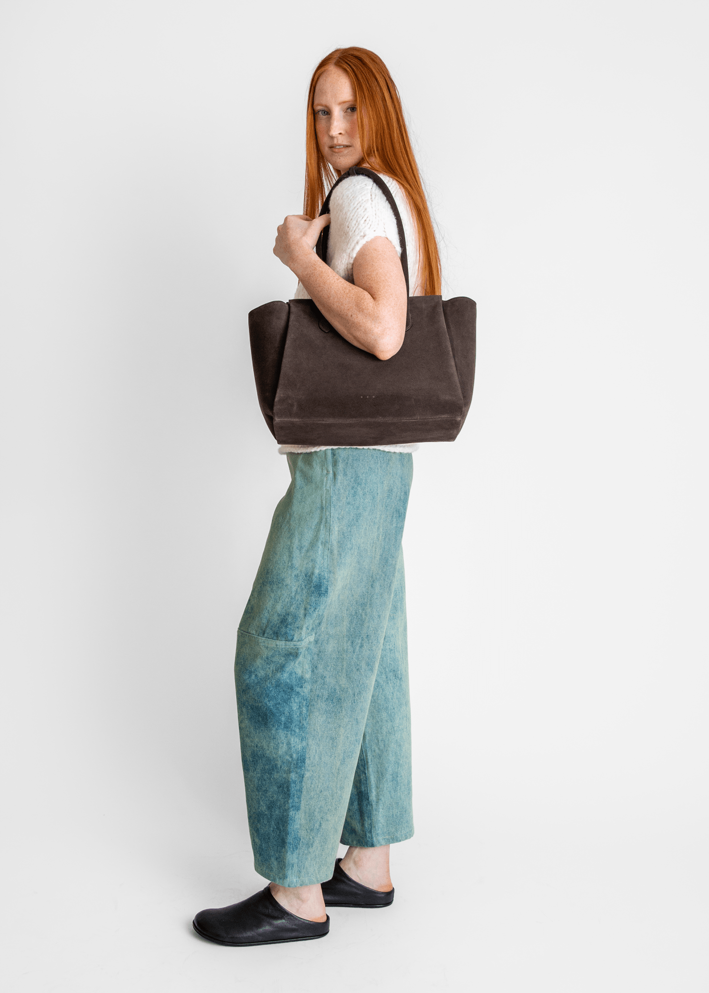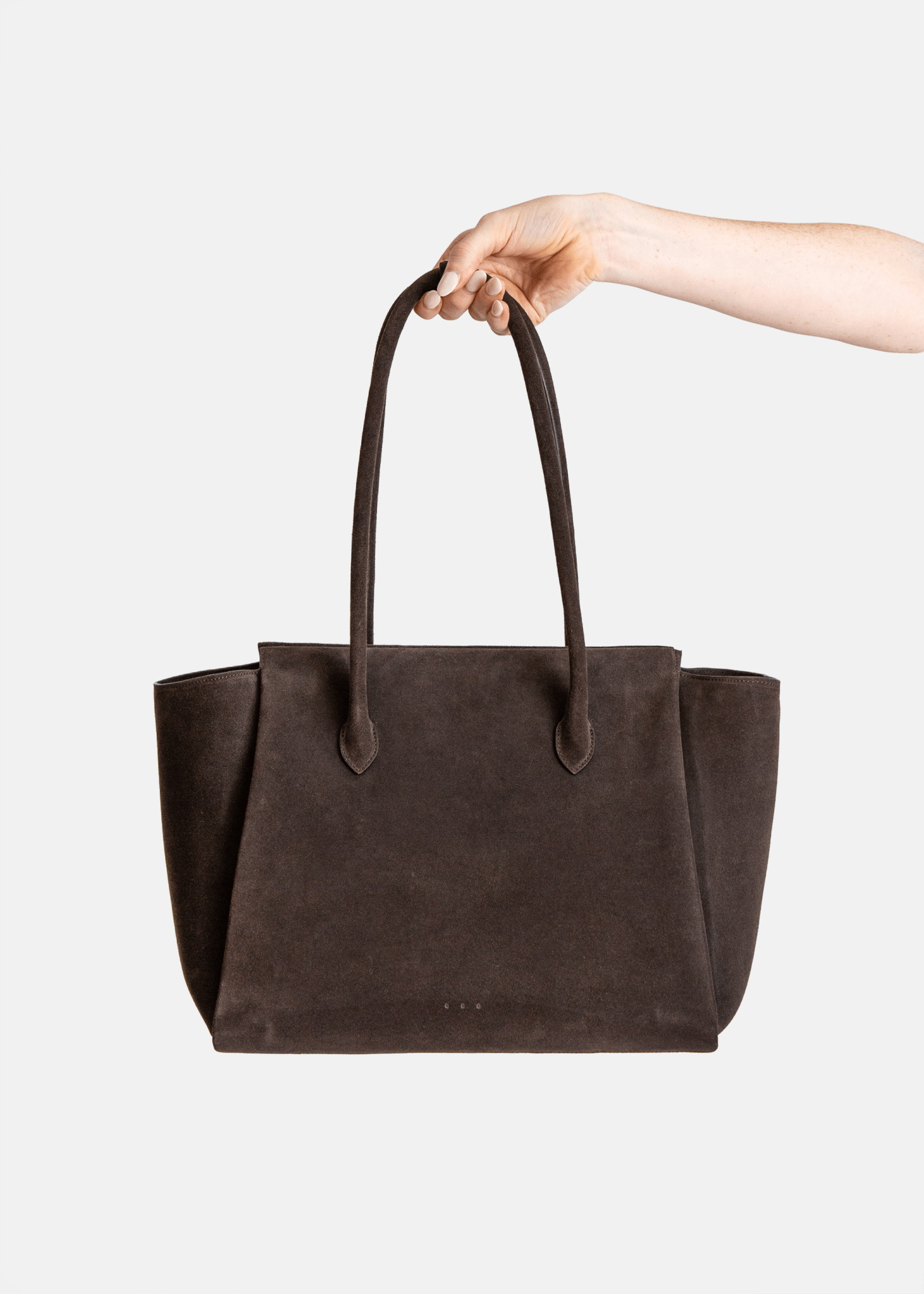 24h carry-all size of Ekme. A timeless piece crafted in smooth, grained or suede calfskin, with roomy capacity, shoulder length straps and magnetic closure. Each side of the bag is joined by layered panels that create soft rounded corners and a sense of depth around every curve.