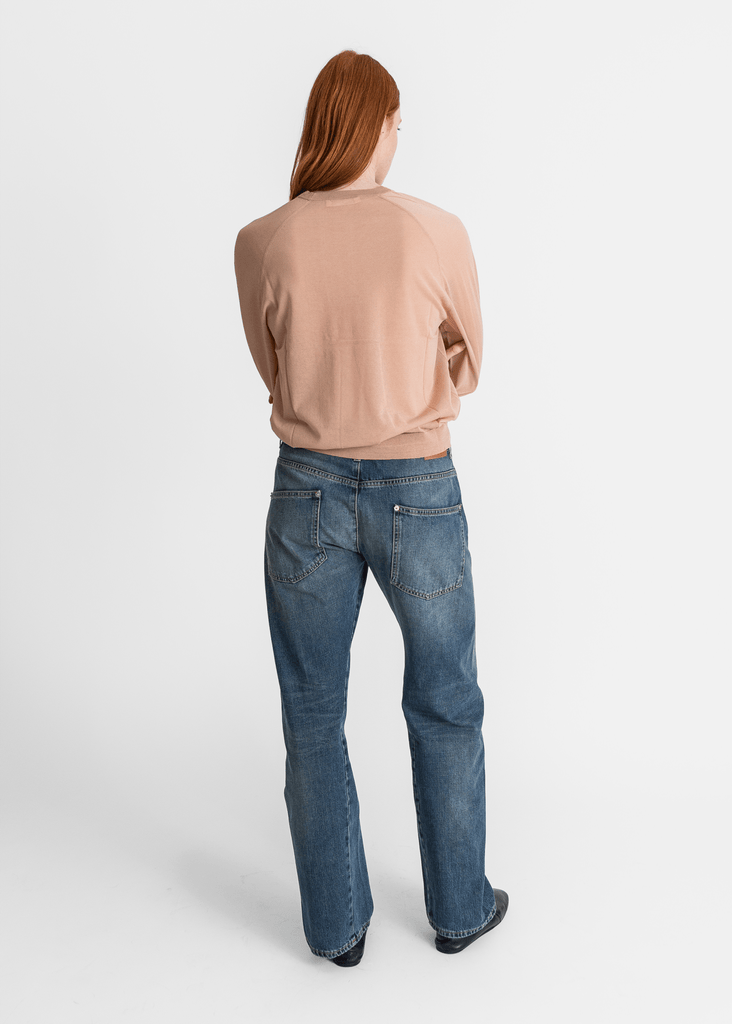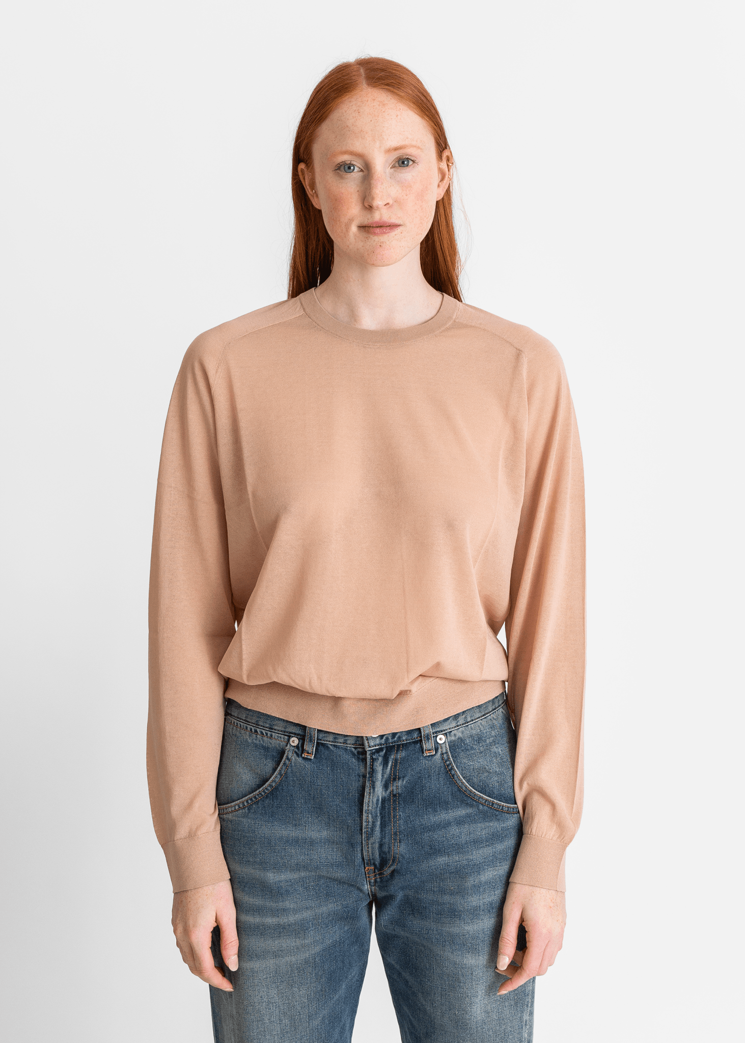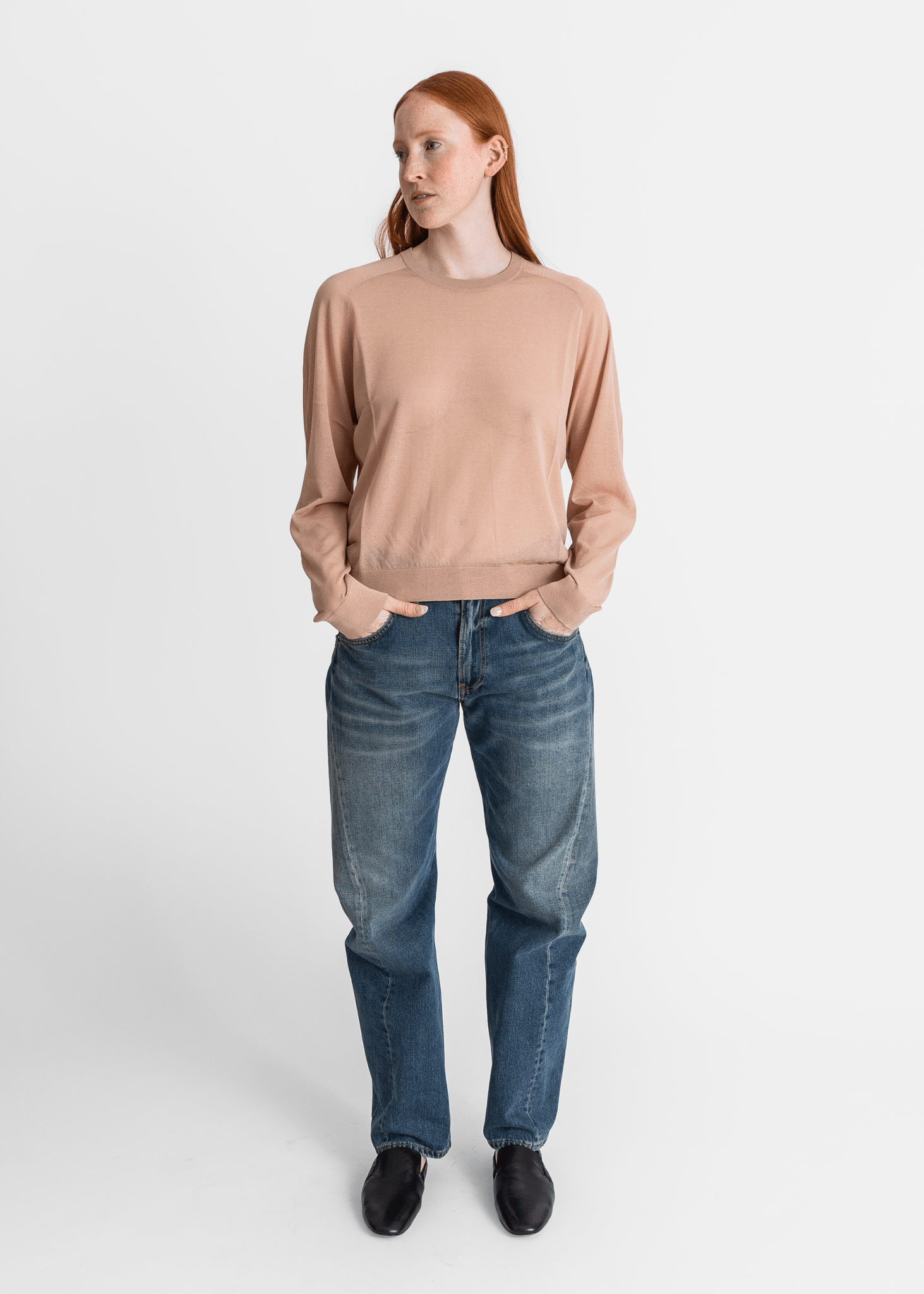 Sheer crewneck sweater knit in a delicate cotton nylon yarn. Relaxed fitting body with rib trim at neckline, bottom hem & sleeve opening.