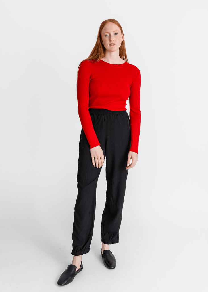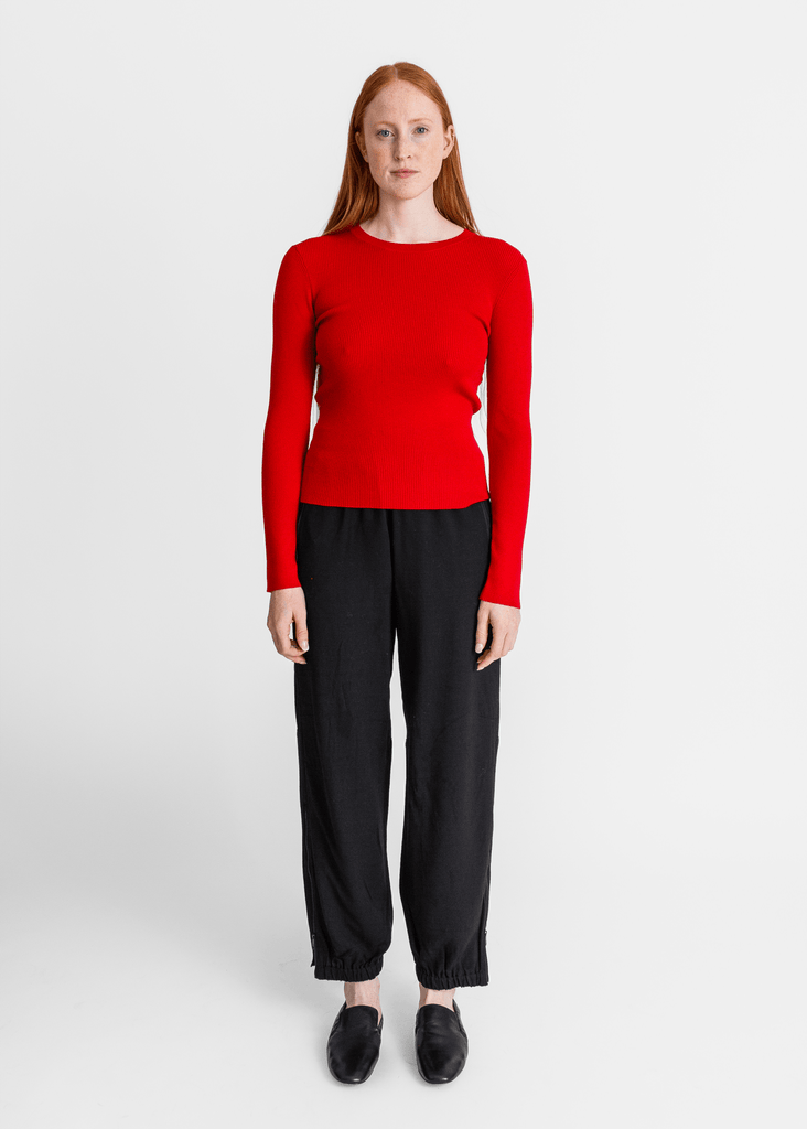 Skinny ribbed crewneck sweater with slim long sleeves knit in a stretchy merino wool blend yarn.